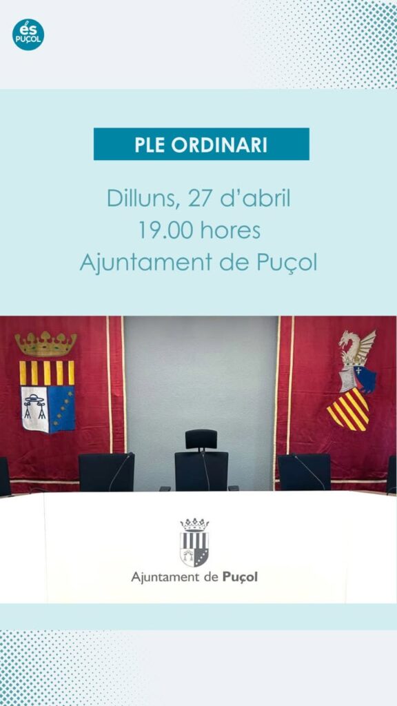HUI, PLE DE L’AJUNTAMENT DE PUÇOL A LES 19.00 HORES